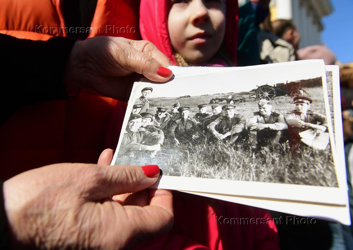 Празднование Дня Победы. Жанровая фотография. Женщина держит в руках военную фотографию в рамках…