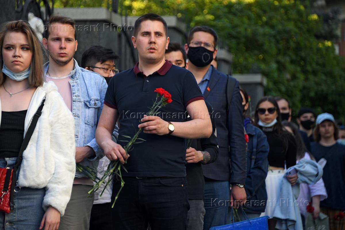 Народ несет цветы к Полномочному представительству Республики Татарстан, в память о жертвах трагедии в казанской школе.