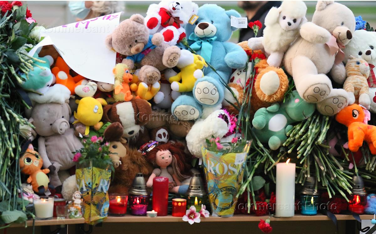 Стихийный мемориал в память о жертвах трагедии в гимназии №175 на улице Джаудата Файзи.