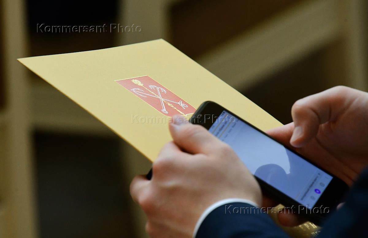 Жанровая фотография. Папка с гербом Санкт-Петербурга и сотовый телефон в руках чиновника