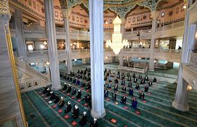 Мусульманский праздник Ураза-Байрам. Верующие перед началом намаза в Московской Соборной мечети.