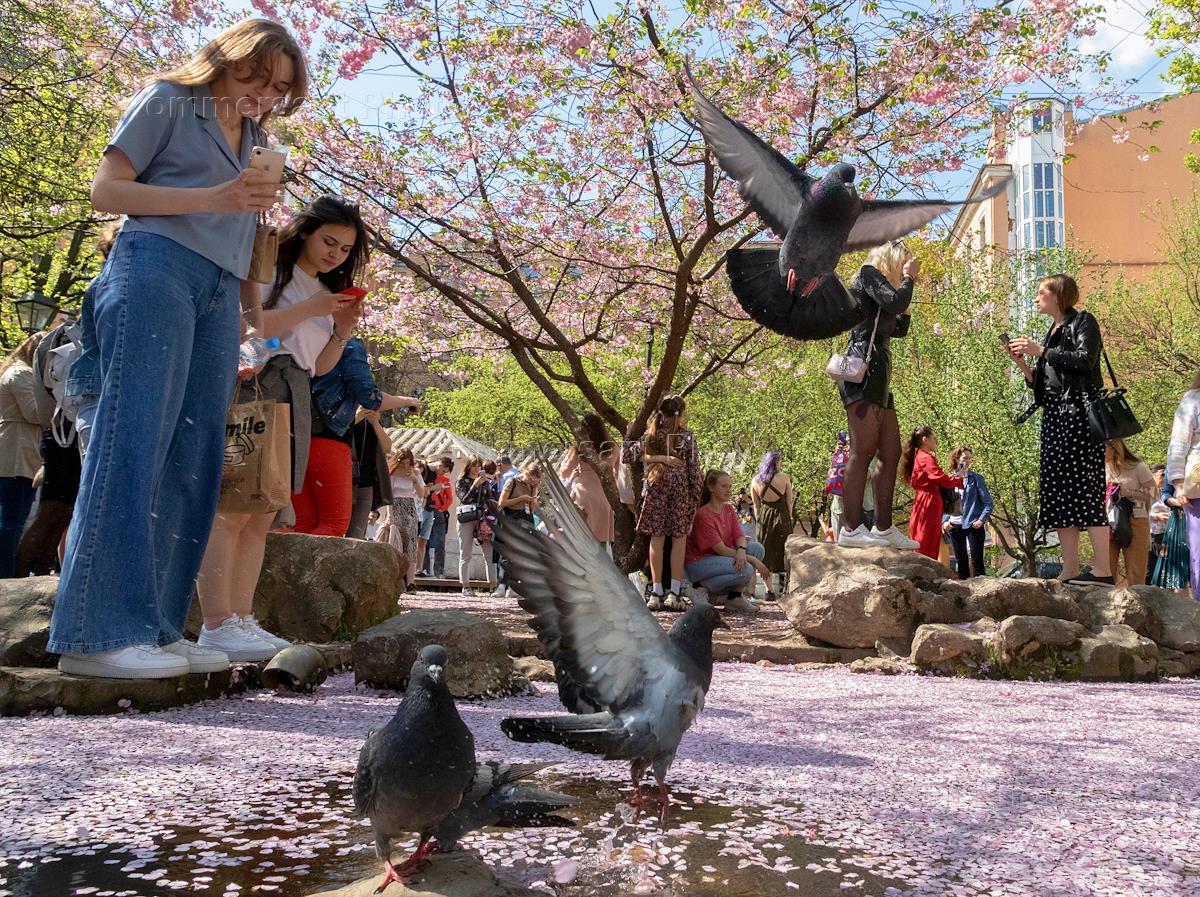 Жанровая фотография. Посетители в Саду Дружбы на Литейном проспекте у цветущего дерева сакуры.