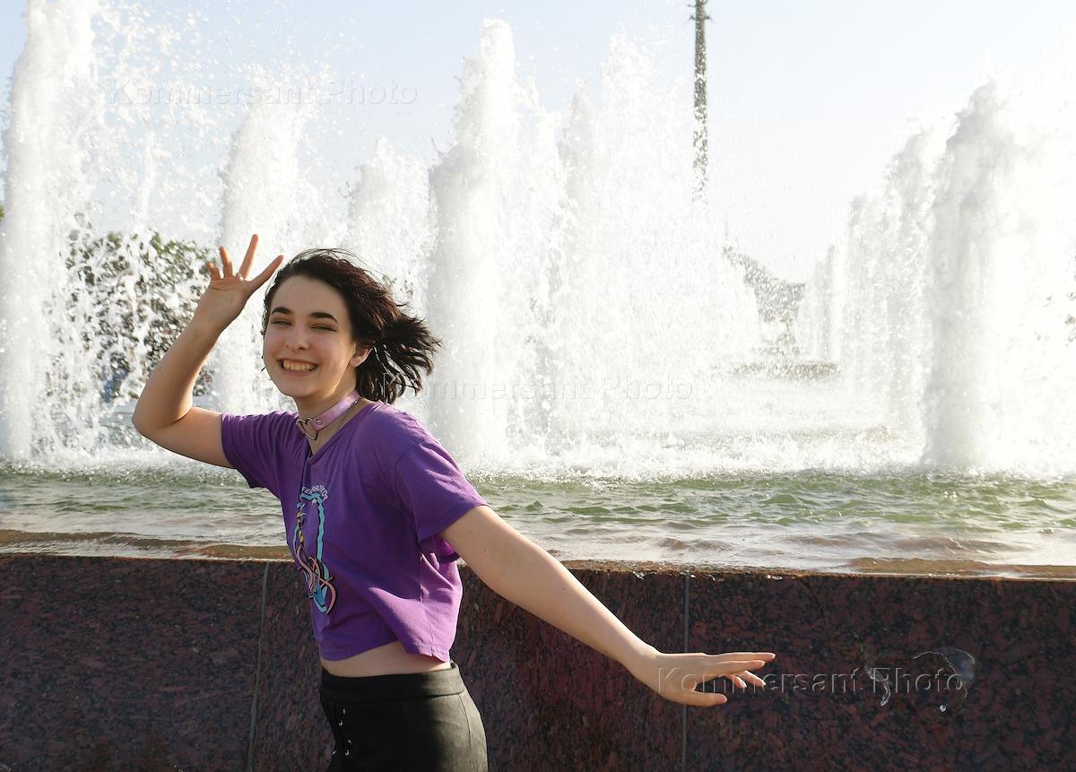 Жара в Москве. Жанровая фотография. Девушка у фонтана на Поклонной горе.