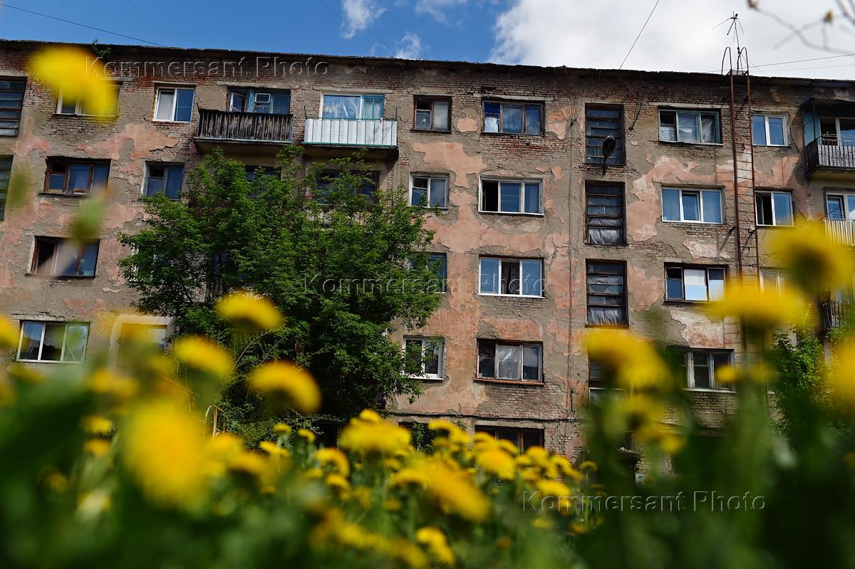 Виды Омска. Жанровая фотография. Цветущие одуванчики на фоне жилого дома.