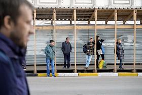 Виды Твери. Жанровая фотография. Люди стоят на остановке общественного транспорта в центре города.