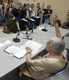 Председатель Хельсинкской группы (МХГ) Людмила Алексеева (справа) на учредительном собрании нового…