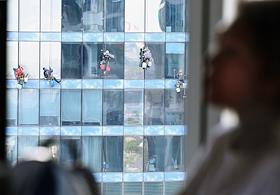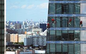Московский международный деловой центр "Москва-Сити". Жанровая фотография. Мытье окон башни…