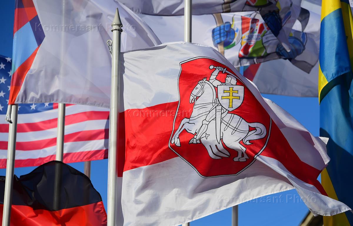 Виды Риги. Жанровая фотография. Флаг белорусской оппозиции "Погоня" среди других государственных…