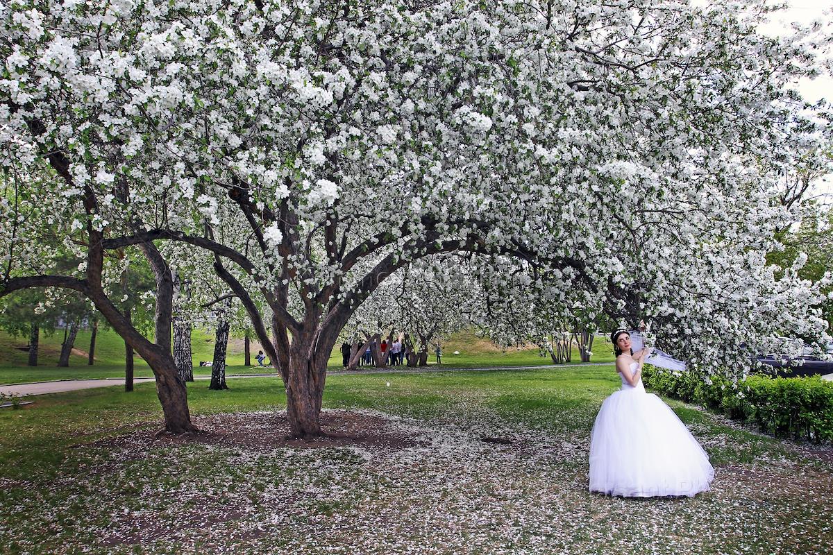 Жанровая фотография. Девушка в свадебном платье стоит на фоне цветущей яблони в одном из скверов в…