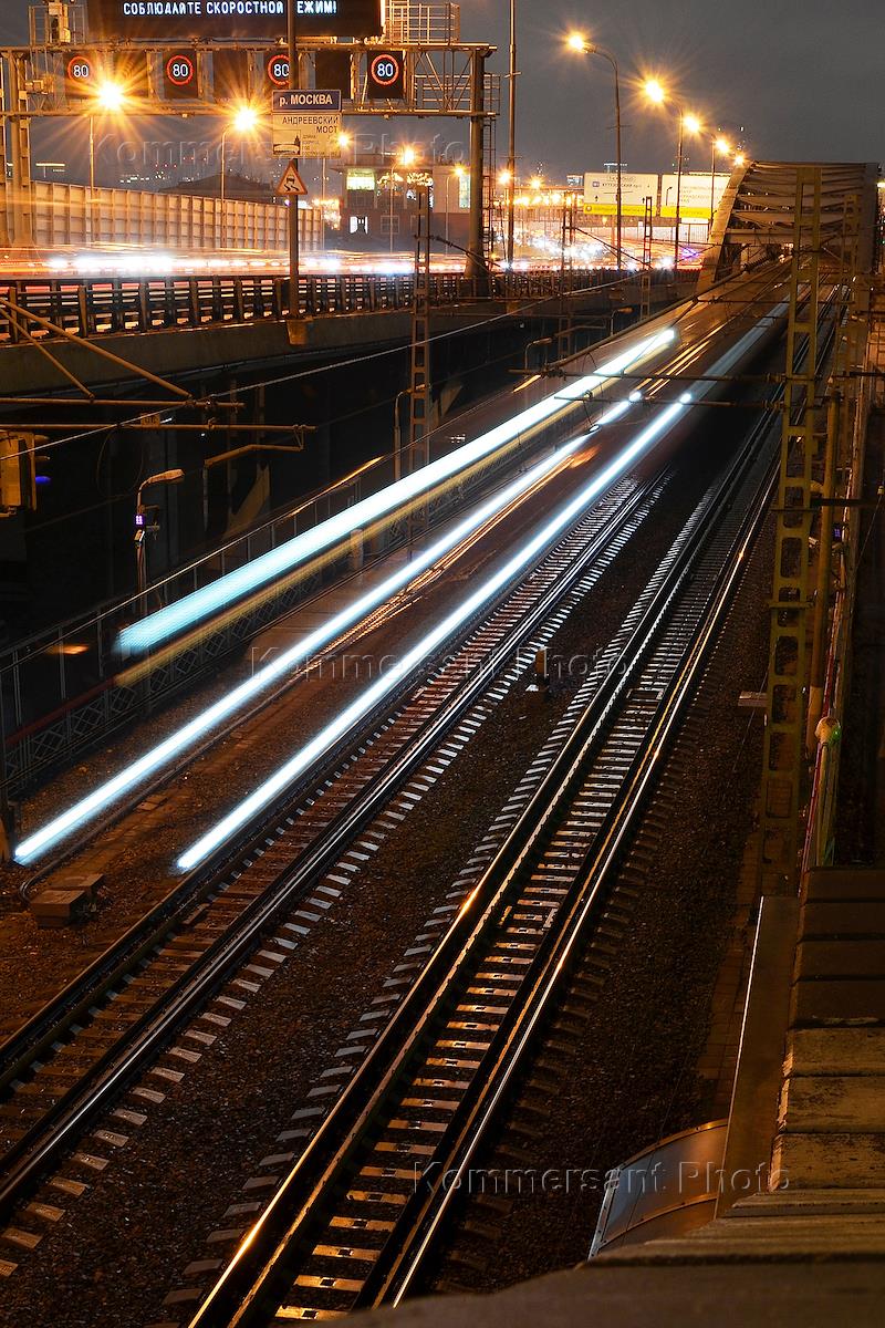 Виды Москвы. Жанровая фотография. Поезд во время движения по Московскому центральному кольцу (МЦК).