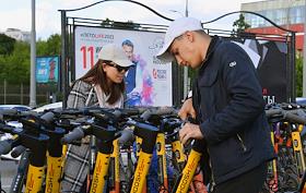 Жанровая фотография. Молодые люди выбирают самокаты на стоянке проката самокатов компании "Сити…