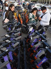 Жанровая фотография. Молодые люди выбирают самокаты на стоянке проката самокатов компании "Сити…
