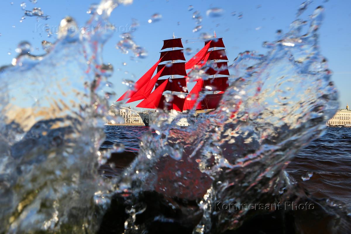 Репетиция праздника "Алые паруса" в Санкт-Петербурге. Бриг "Россия" на причале в акватории Невы напротив Петропавловской крепости.