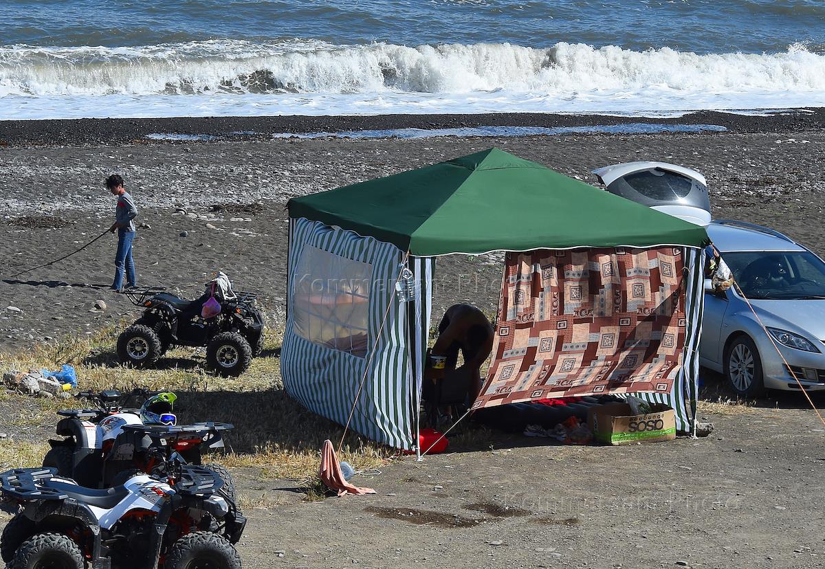 Туристы отдыхающие дикарями на берегу Черного моря.