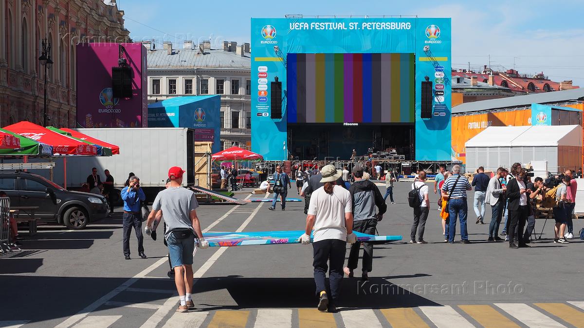 Футбольная деревня на Конюшенной площади в Санкт-Петербурге. Монтаж фанзоны.