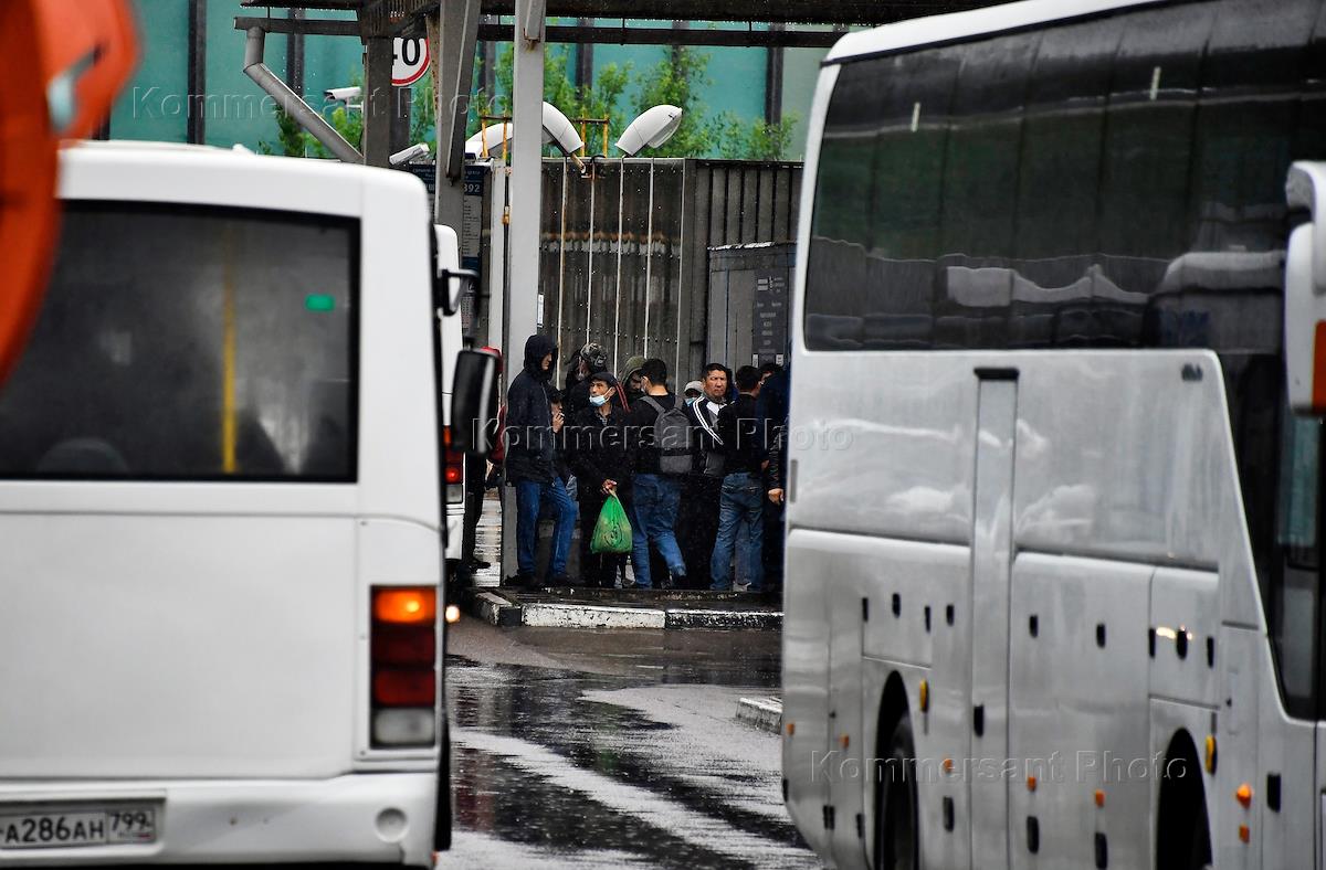 Ситуация около Единого миграционного центра Московской области в Путилково. Мигранты перед входом в…