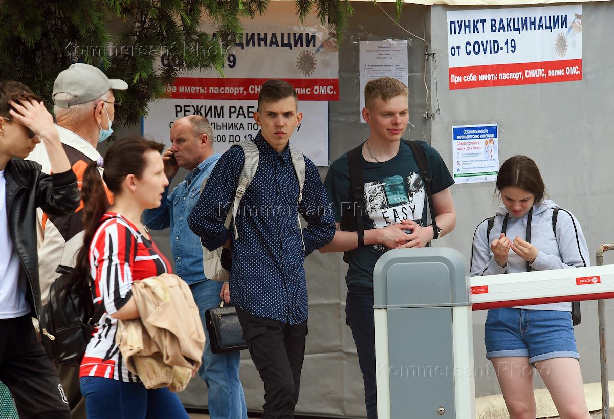 Вакцинация против коронавирусной инфекции COVID-19. Пациенты в очереди возле передвижного…