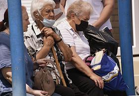 Виды Ялты. Жанровая фотография. Пожилый люди в медицинских масках на автобусной остановке.