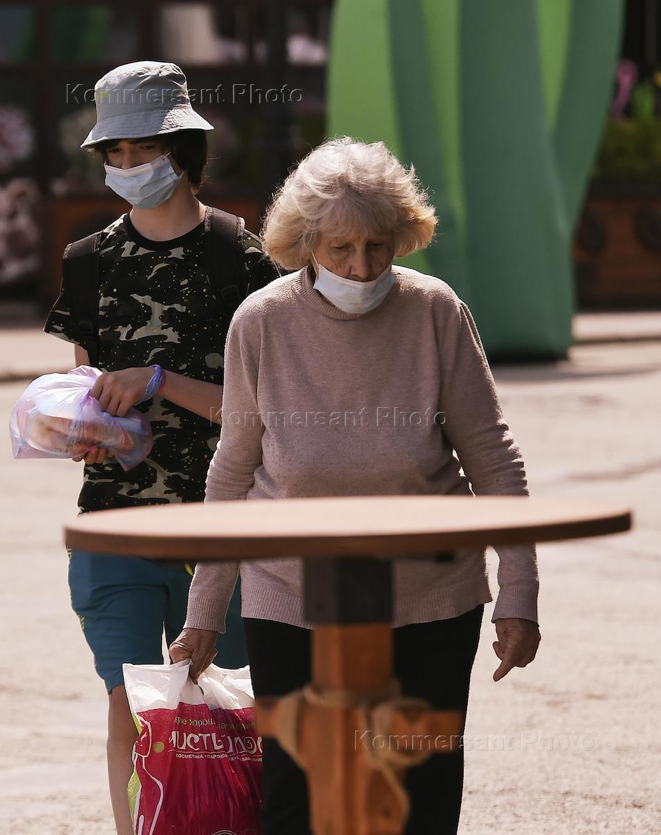 Виды Ялты. Жанровая фотография. Женщины в медицинских масках на улице города.