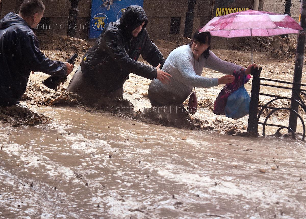 Последствия ливней в Ялте. Люди переходят затопленную улицу в центре города. Река Водопадная вышла…