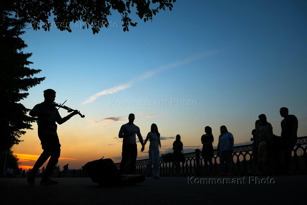 Виды вечернего Кемерово. Жанровая фотография. Уличный музыкант и гуляющие на набережной.