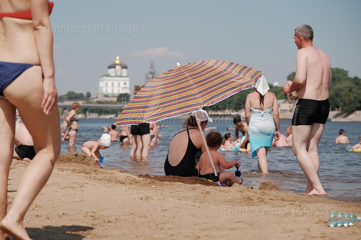 Жители Пскова на городском пляже.