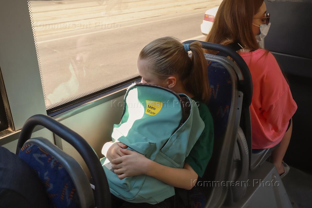 Жанровая фотография. Девочка с рюкзаком в салоне общественного транспорта.