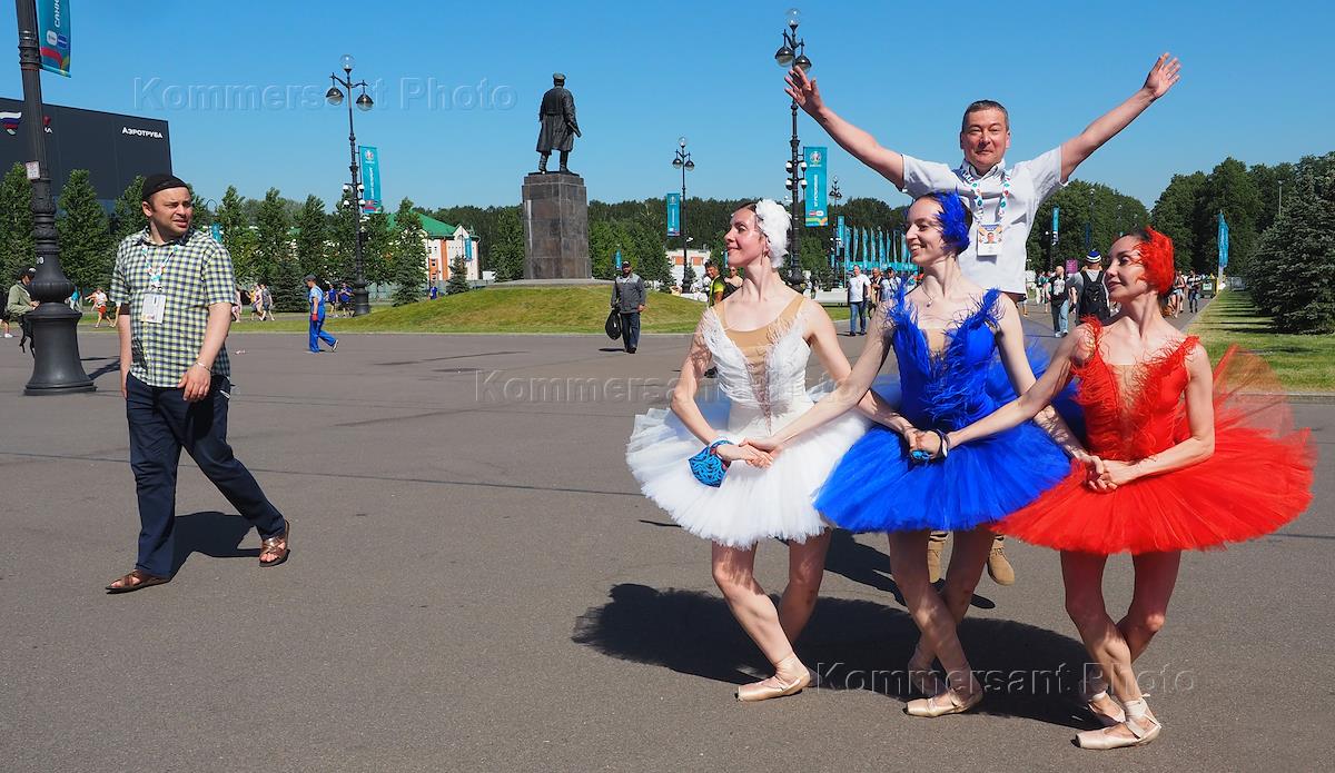 Жанровая фотография. Три балерины в балетных пачках цветов российского флага приветствуют футбольных…