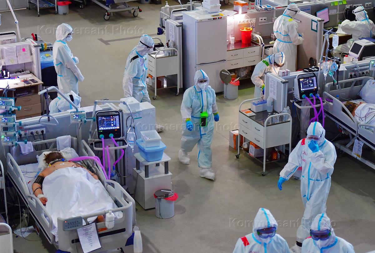 Медицина Временный госпиталь ГКБ им. Ф.И. Иноземцева в Сокольниках. Работа сотрудников больницы в "красной зоне", где лежат пациенты инфицированные коронавирусом.
