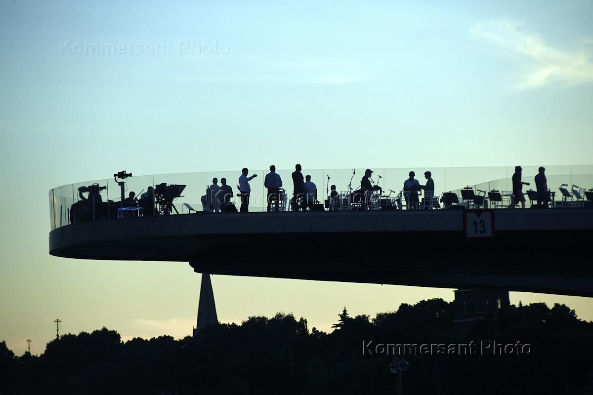 Виды вечерней Москвы. Жанровая фотография. Силуэты людей на "Парящем" мосту над Москвой-рекой в…