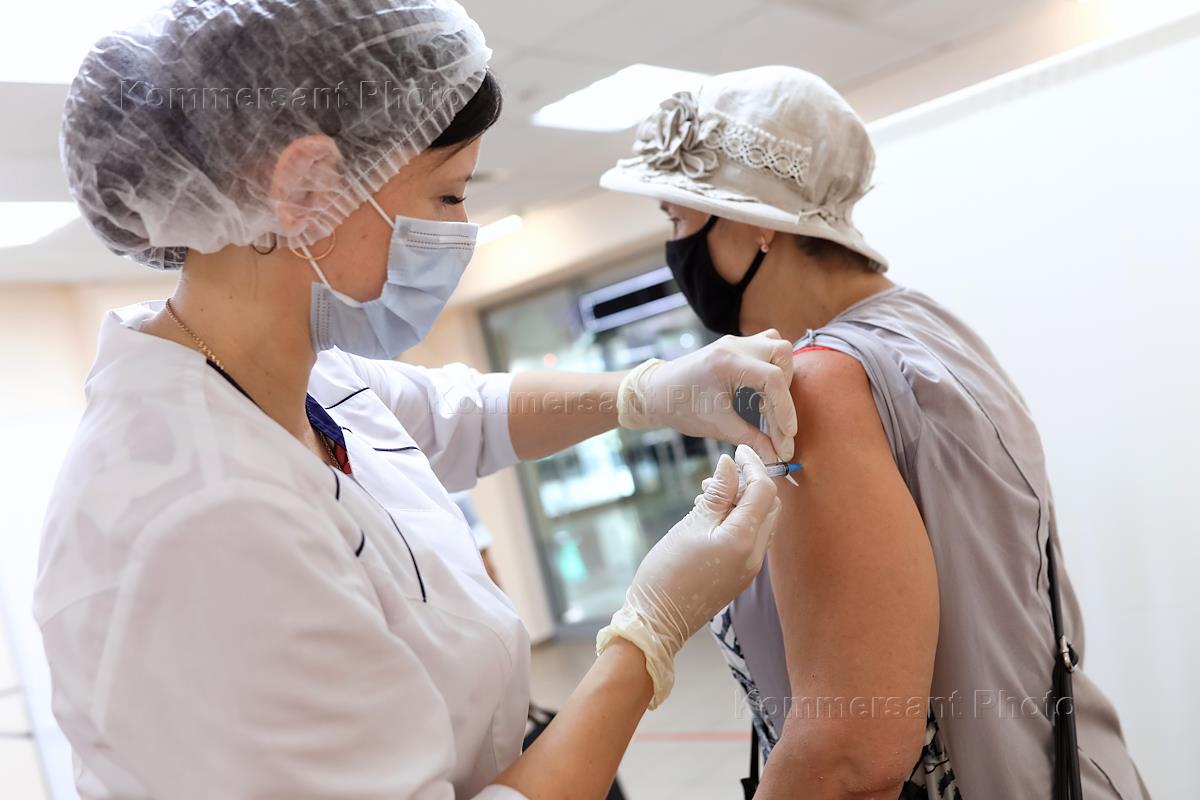 Проведение вакцинации от коронавирусной инфекции COVID-19 мобильными бригадами. Жанровая фотография.