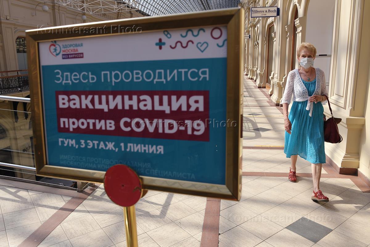 Пункт вакцинации от коронавирусной инфекции COVID-19 в ГУМе. Жанровая фотография. Девушка в…