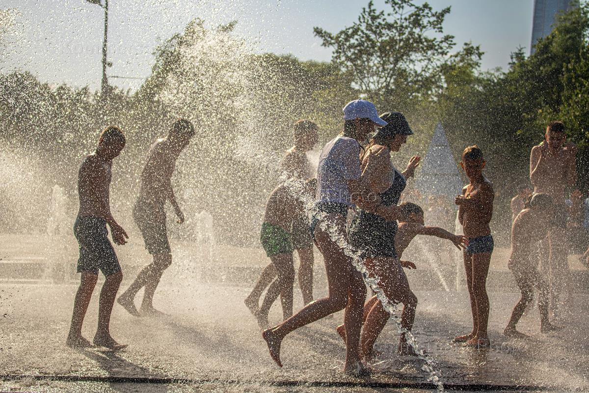 Виды Санкт-Петербурга во время аномальной жары. Жанровая фотография. Жители купаются в фонтане Парка…