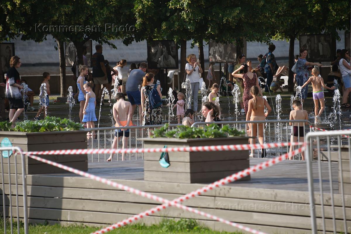 Жара в Москве. Жанровая фотография. Отдыхающие возле фонтанов в парке Музеон.