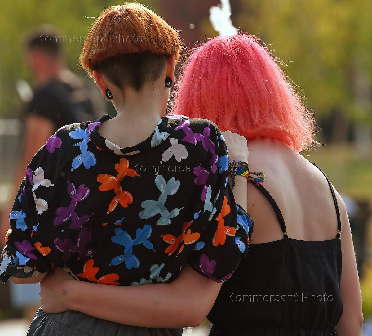 Жара в Москве. Жанровая фотография. Девушки идут в обнимку по улице.