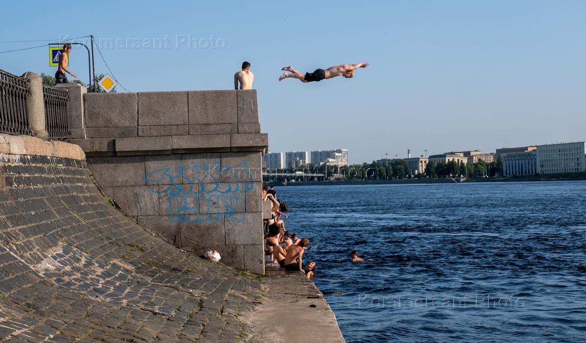 Жанровая фотография. Подростки прыгают в реку Неву с набережной.