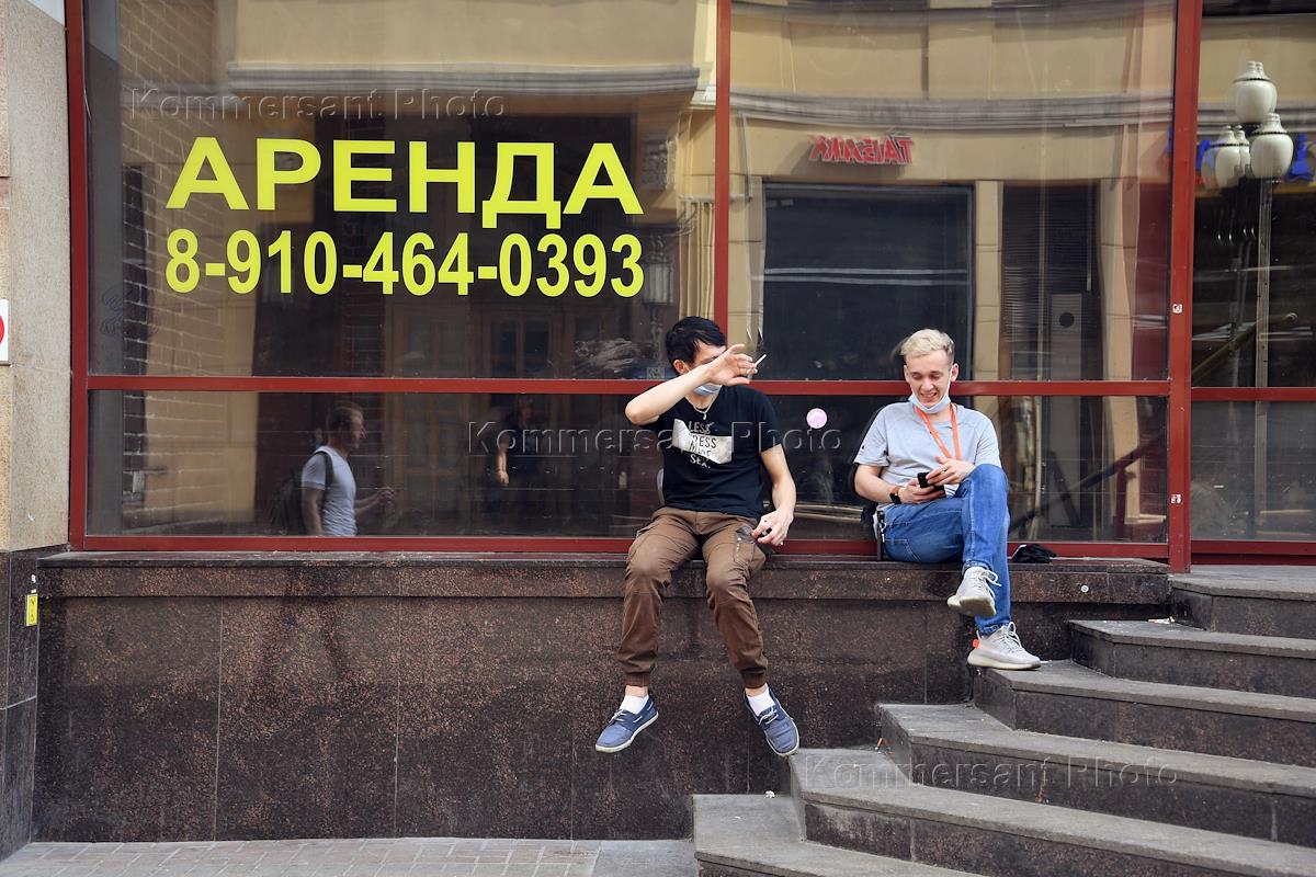 Жанровая фотография. Молодые люди сидят на ограждении здания в центре города с объявлением на стекле…