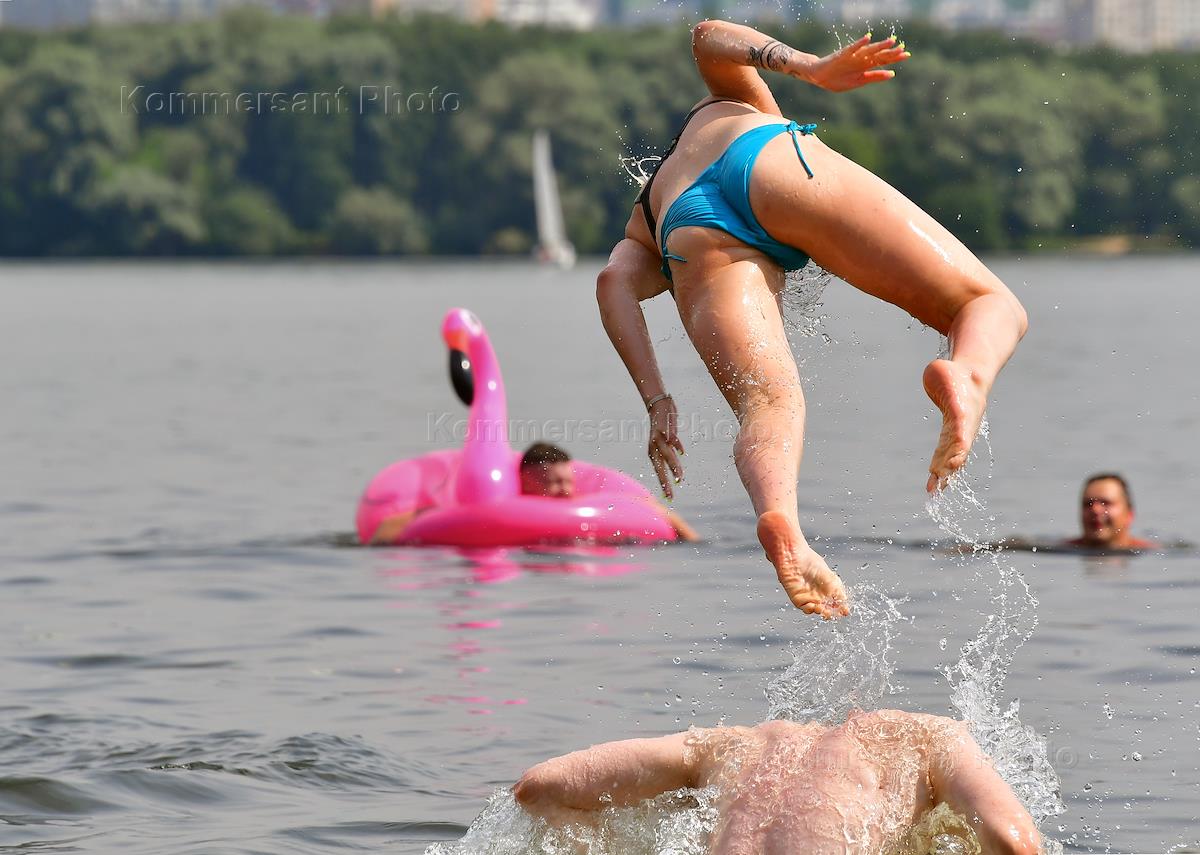 Жанровая фотография. Жара в городе. Отдыхающие во время купании в Москва-реке в Строгино.