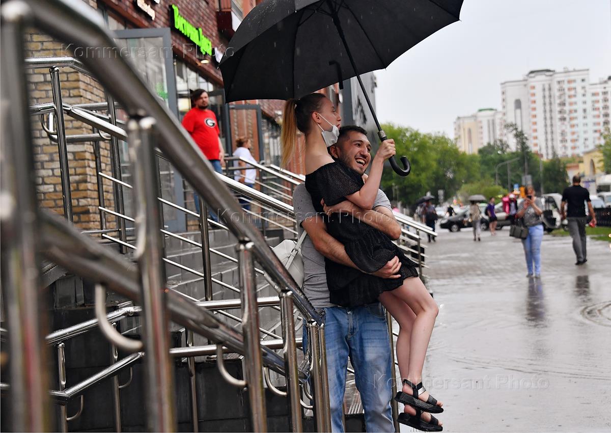 Жанровая фотография. Ливень в городе. Молодой человек держит девушку на руках.