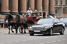 Виды Санкт-Петербурга. Жанровая фотография. Конная карета для туристов и автомобиль "мерседесс" во…