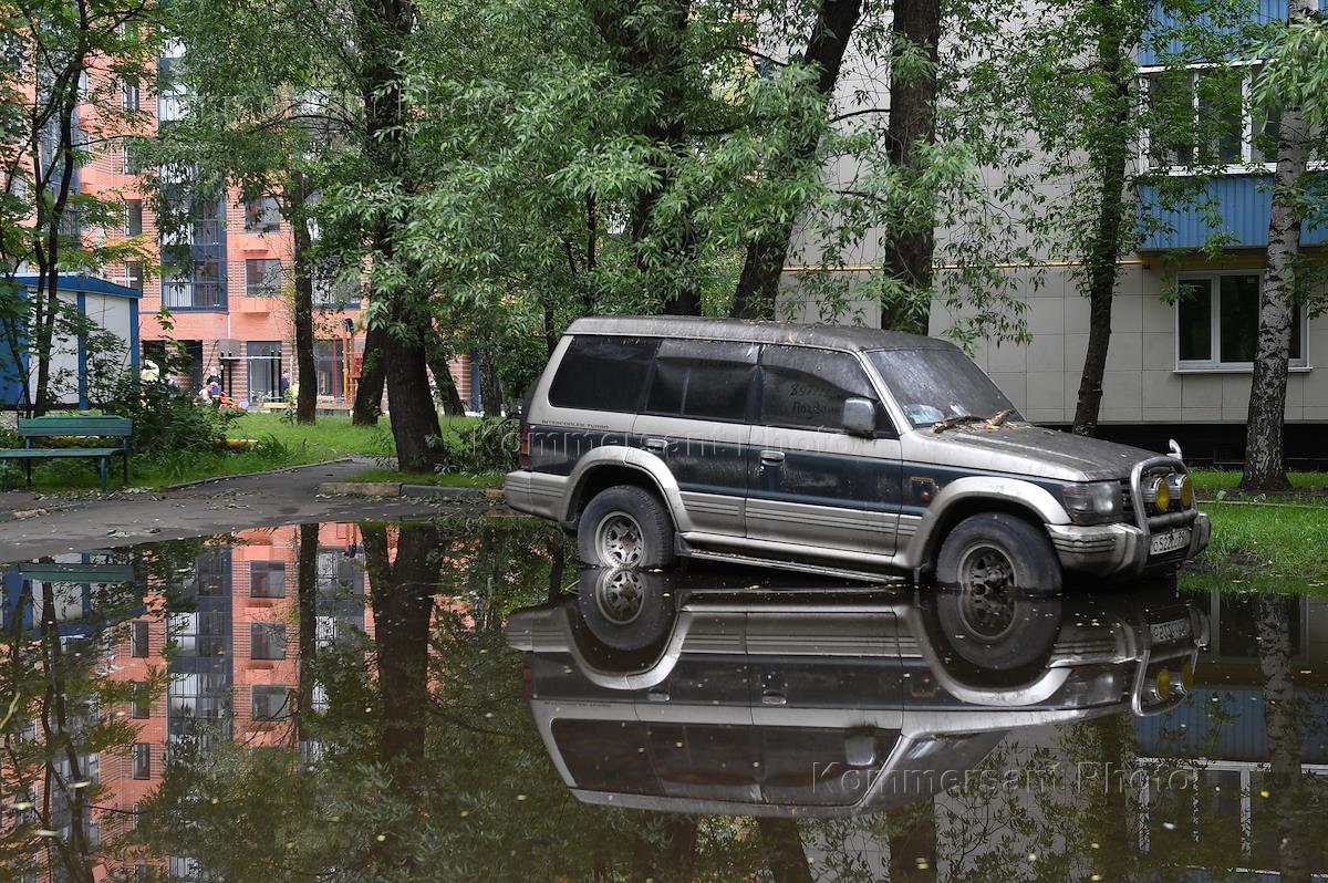 Жанровая фотография. Улица Авангардная. Автомобиль внедорожник стоит в луже во дворе жилого дома.