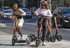 Жанровая фотография. Виды Москвы. Стоянка проката самокатов. Девушки едут на самокате в центре…