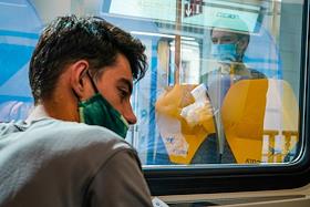 Жанровая фотография. Виды Москвы. Мужчина в медицинской маске на лице в вагоне поезда "Иволга" на…