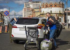 Жанровая фотография. Виды Москвы. Пассажир с вещами и со спящим ребенком на руках садится в…