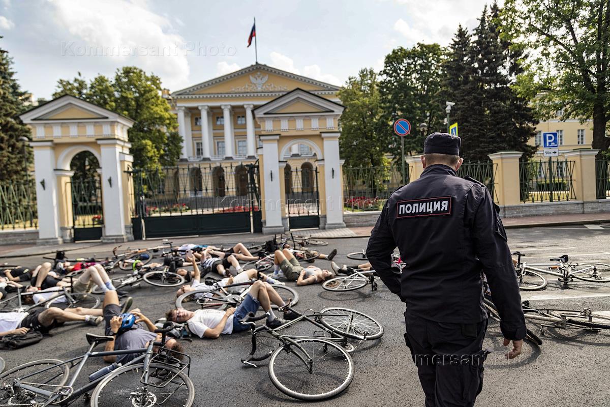 Общество Акция Петербургских велосипедистов перед зданием администрации Санкт-Петербурга (Смольный) в память о погибшем под колесами автомобиля 27 июня Эдуарде Шалухове