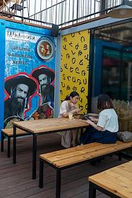 Виды Санкт-Петербурга. Жанровая фотография. Посетители кафе на территории Василеостровского рынка.