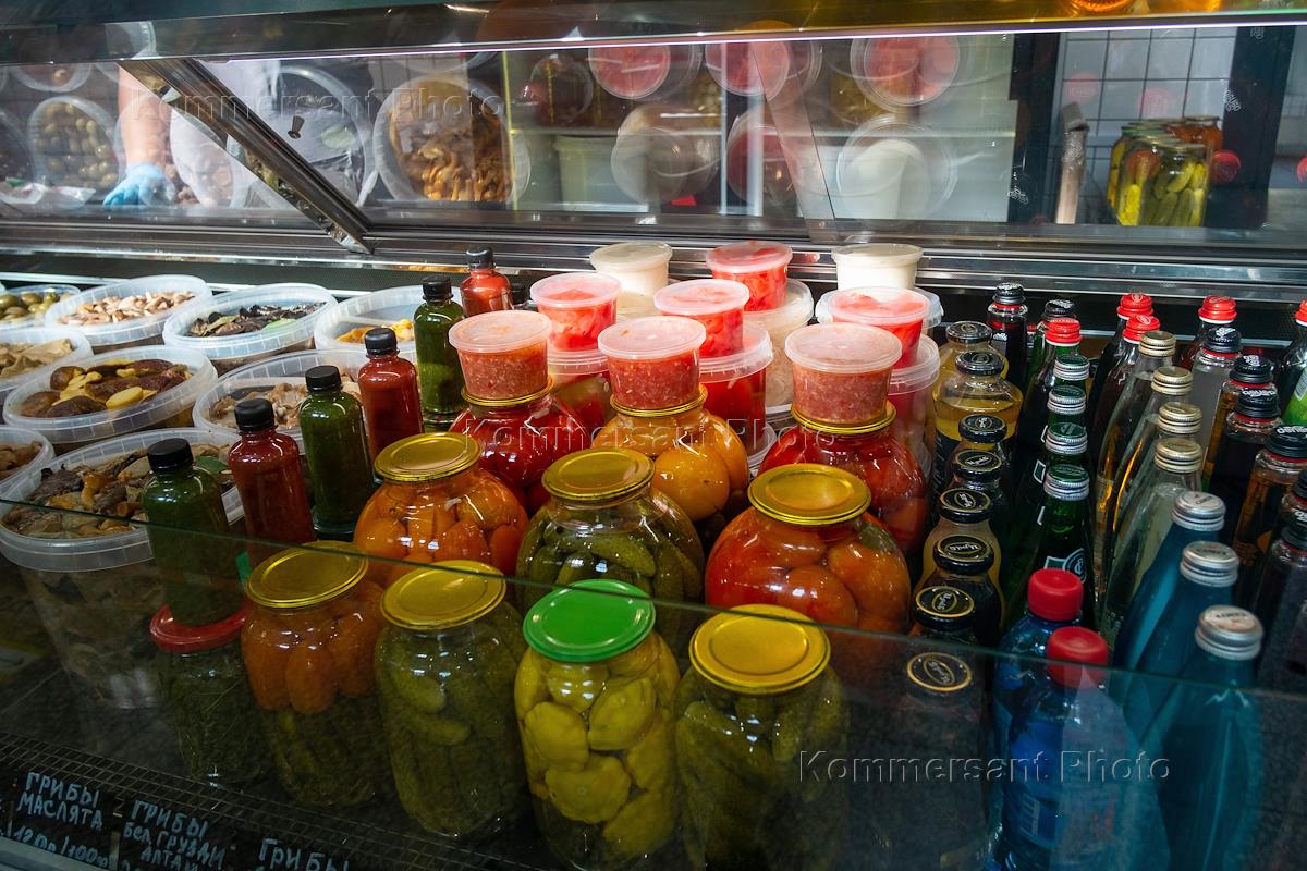 Виды Санкт-Петербурга. Жанровая фотография. Прилавок с консервацией на Василеостровском рынке.