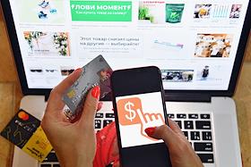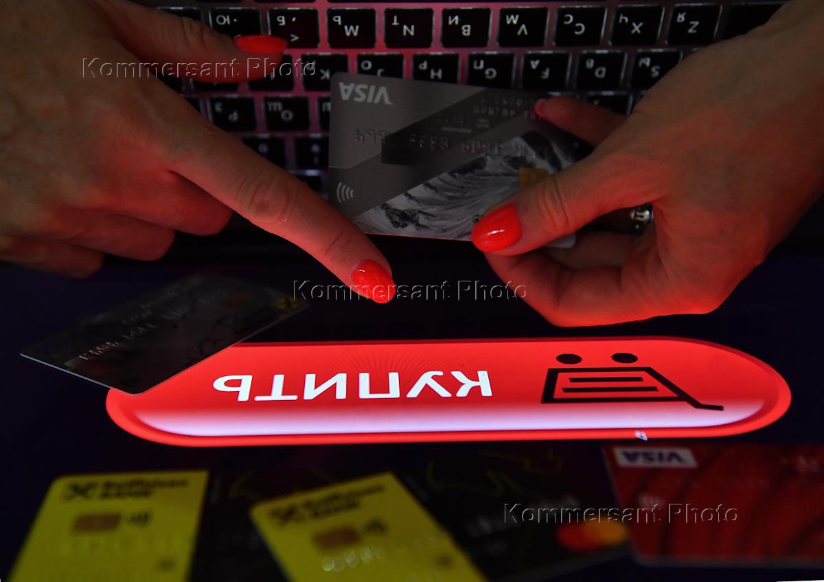 Жанровая фотография. Женщина держит в руке банковскую карту во время оплаты покупки через интернет.