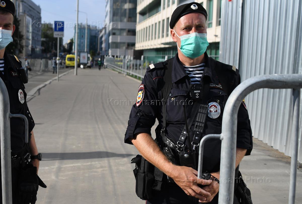 Праздник жертвоприношения Курбан-Байрам. Жанровая фотография. Сотрудники полиции у ограждений у…