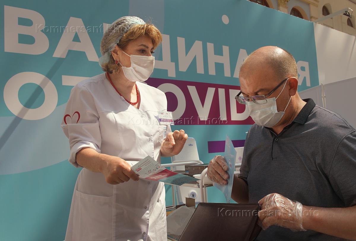 Работа сотрудников центров услуг "Мои документы" и Департамента соцзащиты в пункте вакцинации и вакцинация в Гостином Дворе.
